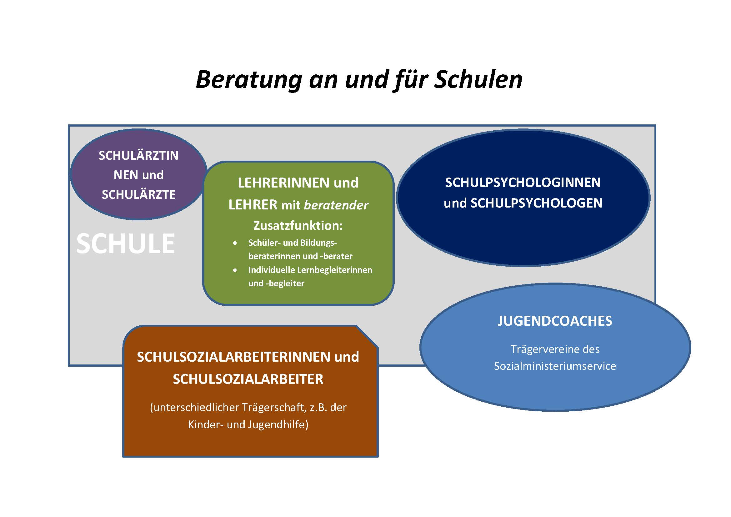 (Bio-)Psychosoziale Beratung und im weitesten Sinne „Problemberatung“ wird von verschiedenen schulischen Beratungsprofessionen mit ihren entsprechenden Schwerpunkten angeboten. Zu den Unterstützungssystemen zählen zum einen Teil Lehrkräfte mit Zusatzausbildungen wie Schüler- und Bildungsberaterinnen und -berater. Zum anderen Teil sind es Angehörige weiterer Professionen wie Schulpsychologinnen und Schulpsychologen, Schulsozialarbeiterinnen und Sozialarbeiter, Jugendcoaches sowie Schulärztinnen und Schulärzte.